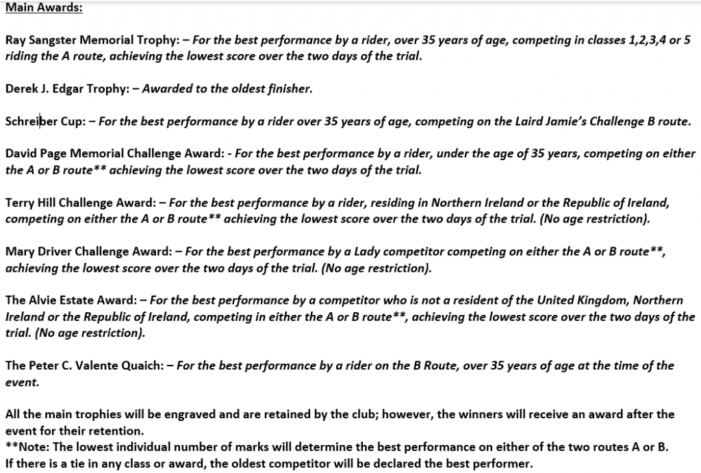 The Terry Hill Challenge Award will be presented to the rider who makes the best performance by a resident of Northern Ireland or the Republic of Ireland, over either the A or B routes during the 2026 trial.